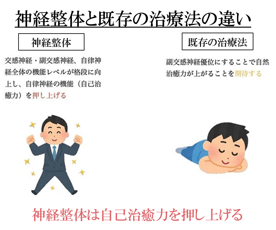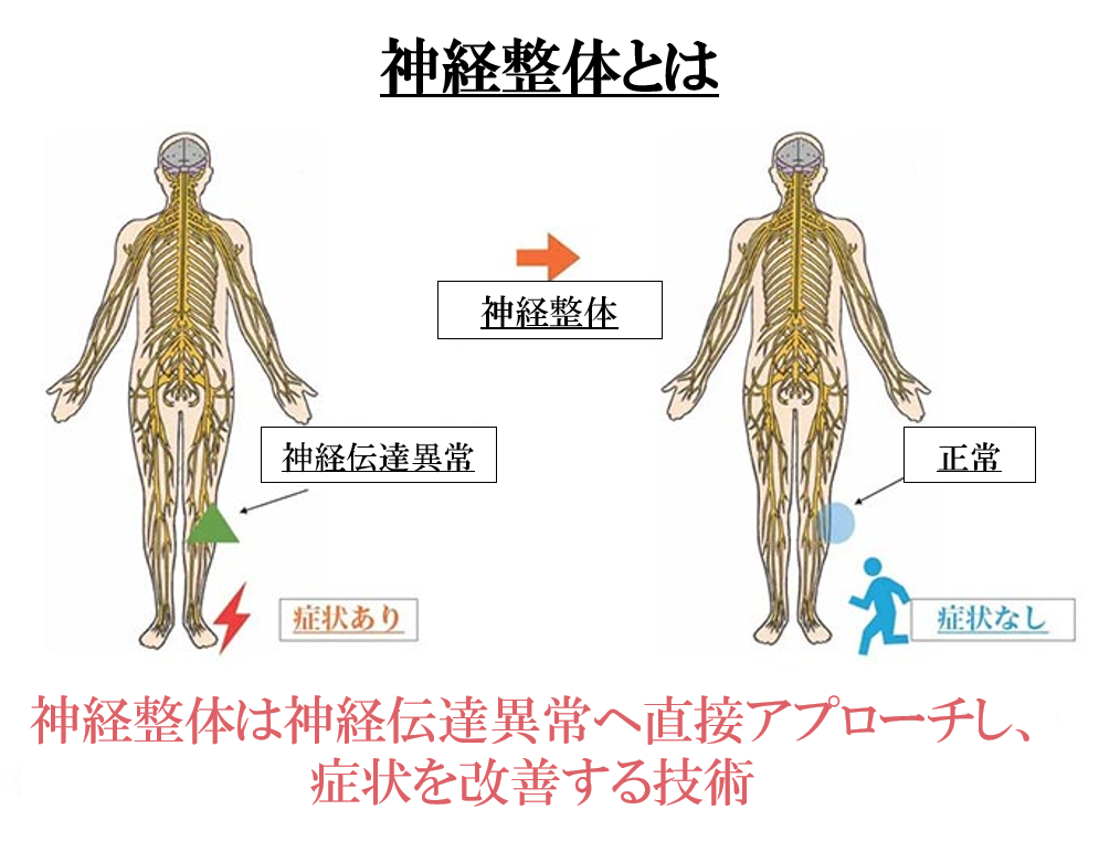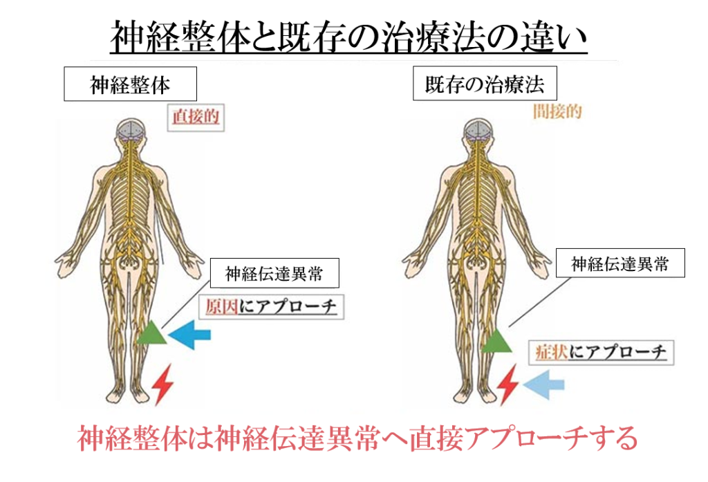 それに対し神経整体は、神経伝達異常の根本原因である神経に対して、増幅という技術を用いて、“直接的”にアプローチできる手技です。